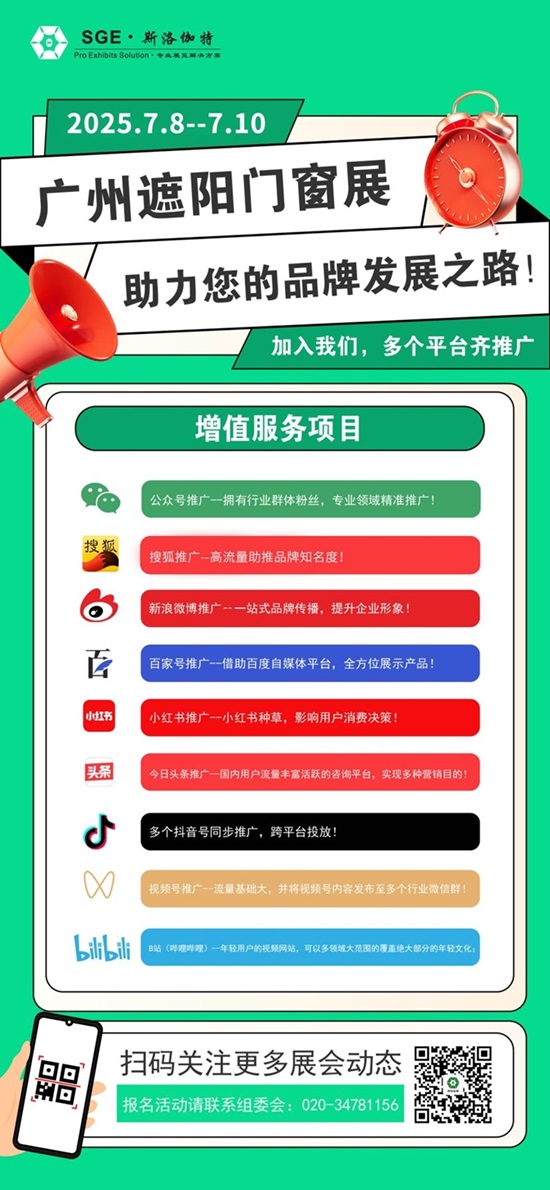 【展会介绍】 由广州斯洛伽特展览策划有限公司主办的第十五届广州遮阳门窗展览会于2025年7月8-10日在广州国际采购中心隆重拉开帷幕,本届展会将以“智能科技,绿色建筑,节能环保”为主题,专为内外销贸易商量身打造专业的商贸平台。作为建筑材料行业的 “风向标”,为经销商、房地产开发商、工程商、甚至设计师、装饰装修市场、建材市场、门窗市场、建材超市等提供一个最佳的采购平台,也为企业提供一个展新品、推品牌、拓市场、建渠道的最佳良机,以创新之力重塑行业格局,以资源汇聚激活无限商机。 聚焦第15届广州遮阳门窗展,新品首发,以创新科技抢占市场先机;品牌亮相,借行业盛会提升市场影响力;渠道拓展,与优质采购商深度对话,构建稳固商业版图。展会同步举办高端论坛活动,对话权威,解读行业趋势,精准对接资源,为企业开拓市场注入强劲动能。 广州遮阳门窗展于每年的7月8-10日在广州国际采购中心举办,依托琶洲国际会展商圈,秉承宗旨,汇聚门窗纱窗、建筑遮阳、电动门窗、别墅门楼梯、户外建材、道闸停车场系统、阳台定制、别墅大宅等领域,在这里,您将网罗遮阳门窗、新型建材、智能设备等全品类产品。从高端定制到普惠精品,从前沿技术到成熟方案,一站式满足多元采购需求。 广州遮阳门窗展览会自举办以来,得到了行业人士的大力支持和关注,助力推动了整个行业的优质发展。厂家与厂家之间相互学习指导经验,经销商与厂家互动合作,为经销商和采购商带来更多盈利产品,我们将一如既往的为展商保驾护航,提供完善的服务、为加快行业发展而努力前行。 自2011年运营以来,广州遮阳门窗展已经走过14个年头,经过多年的积累,本展会品牌效应不断提升,行业影响力与日俱增。2025年,我们依旧与您相约国际采购中心,专注于行业的专业化、纵向化发展,以“品牌聚首,行业互通,资源共享,市场共融”为特点,继续发挥行业风向标作用,着力打造一场“品牌化、国际化、综合化”的第15届广州遮阳门窗展览会! 【展会推广】 主办方通过线上、线下相结合的模式,多平台、多渠道的推广本次展会,得到了行业人士的认可和支持。公司运营14年来,积累了行业经销商、代理商、设计师、工程商等众多建材行业资源,整合上下产业链,为行业搭建一个不可或缺的行业平台,继续携手行业品牌持续发力,专注行业专业化、纵向化发展。